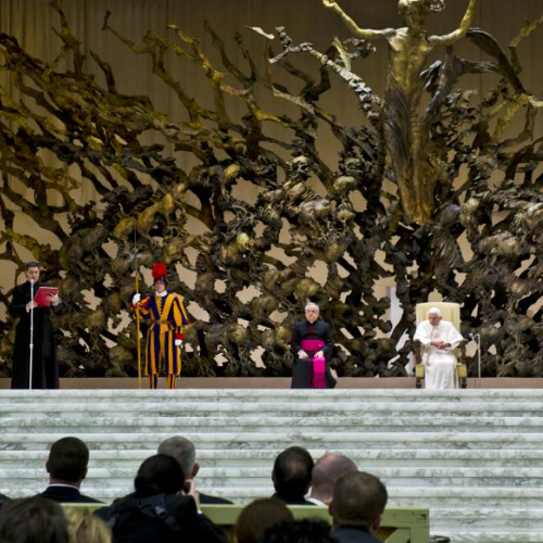 Plaatje: Let eens goed op de achtergrond achter de troon van het Vaticaan
