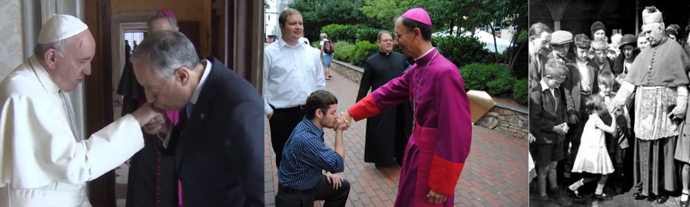 De traditionele manier waarop men een bisschop begroet bestaat in het knielen en het kussen van zijn ring. Wat weinigen weten is dat de Kerk deze akte van nederigheid en respect voor het kerkelijk gezag beloont met de vergiffenis van dagelijkse zonden (maar niet doodzonden). De reden waarom de hand van een bisschop gekust wordt (en in de latijnse wereld ook de hand van een priester), is omdat de handen van bisschoppen en priesters geconsacreerd zijn. Hun handen zijn daarom het ultieme symbool van het priesterschap. De ring van een bisschop symboliseert het apostolisch gezag.